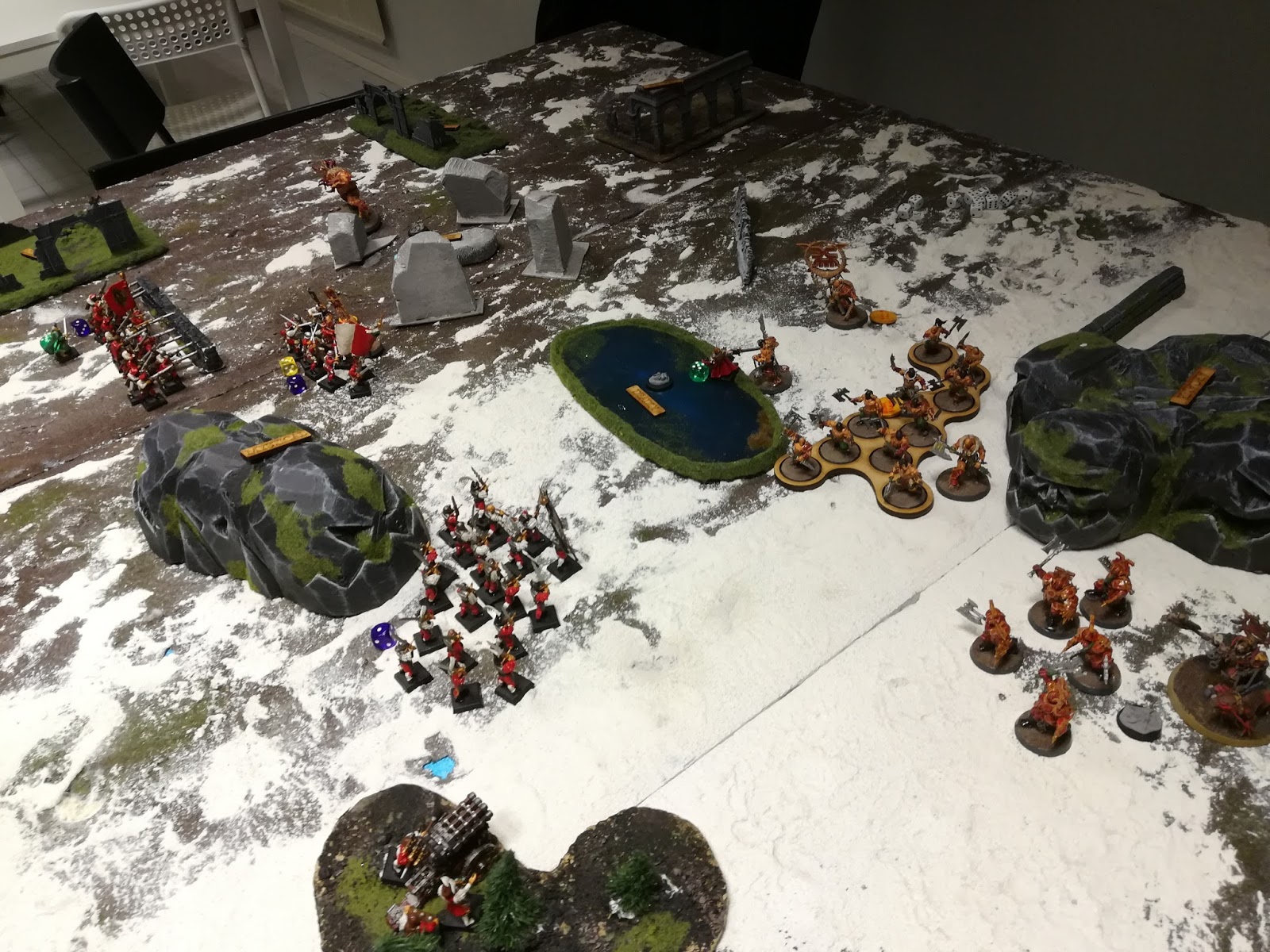 The servants of Chaos pressed on through the field, their leader Galathor Skullcleave leading his Blood Warriors to approach one freeguilder flank while the Khorgoraths advanced on the other. Bloodsectrator Ragrax struck the pole of his totem deep into the frozen ground, resulting in a blast of heat that melted the snow around him. The totem began to glow bright as forged steel, opening a rift in reality to pour in chaotic energies from Khorne's realm into this one. The ground beneath the giant man's feet began to turn into polished brass, the stain constantly creeping outwards to gain more land.